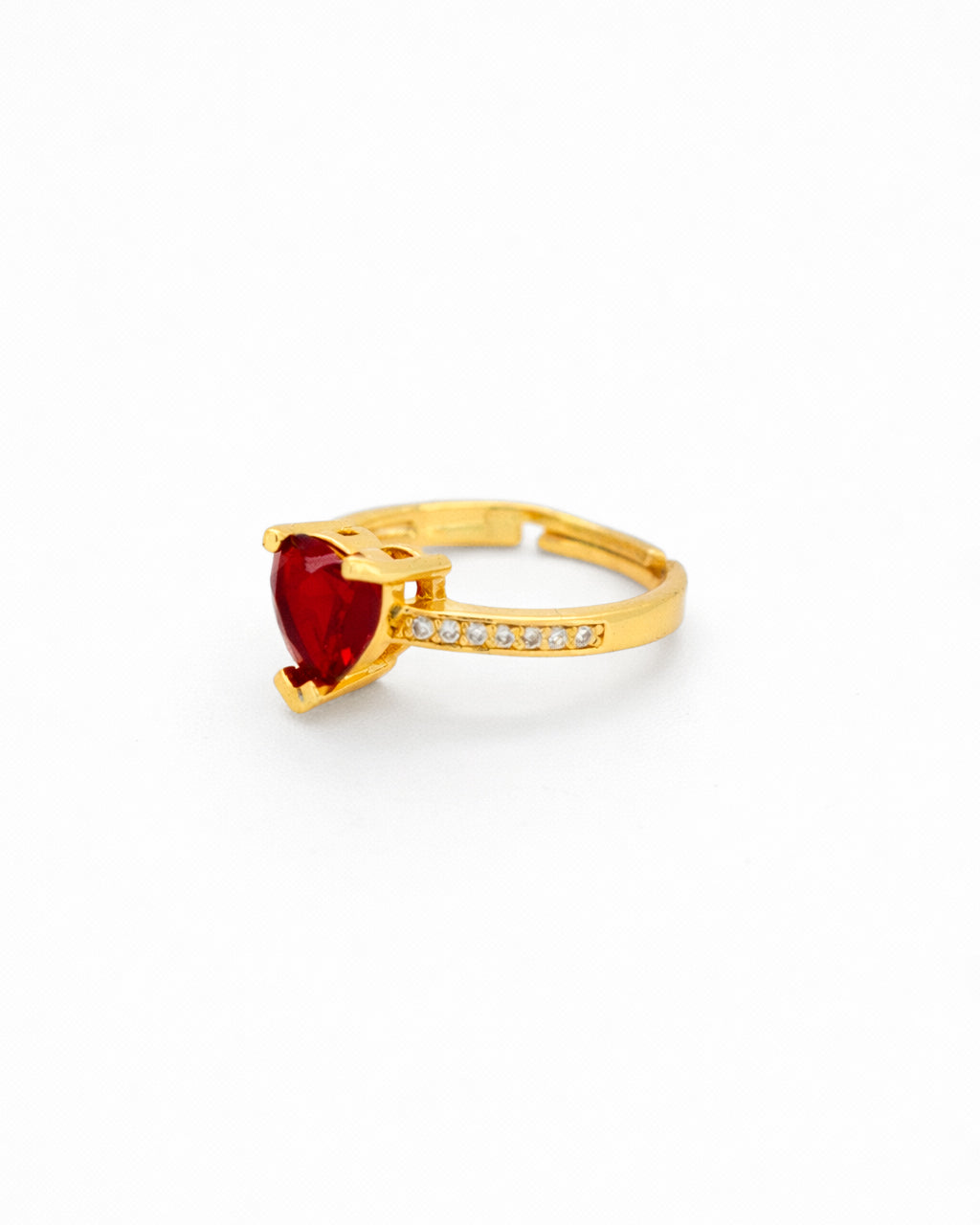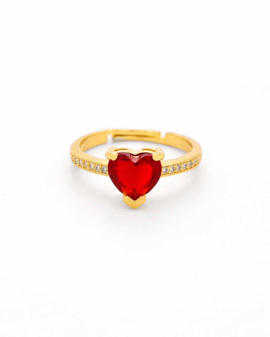 Anillo de chapa de oro en tono dorado brillante, con delicado diseño de corazón central en tono rojo, el aro incorpora zirconias laterales.