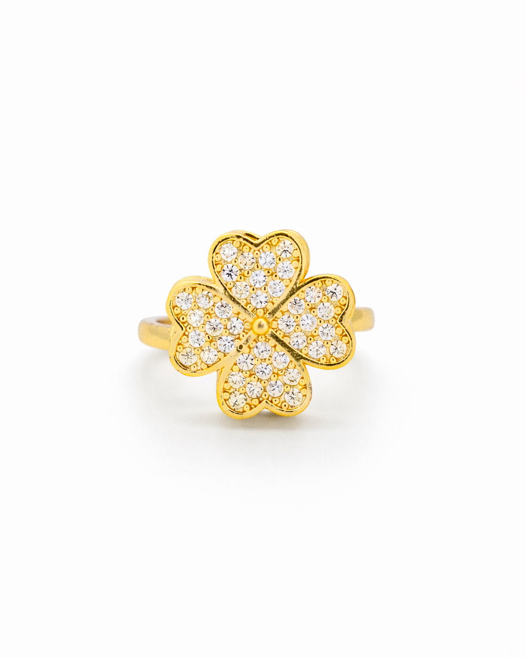 Anillo de chapa de oro en tono dorado brillante, con delicado diseño de trébol de cuatro hojas giratorio, formado por corazones y decorado con zirconias.