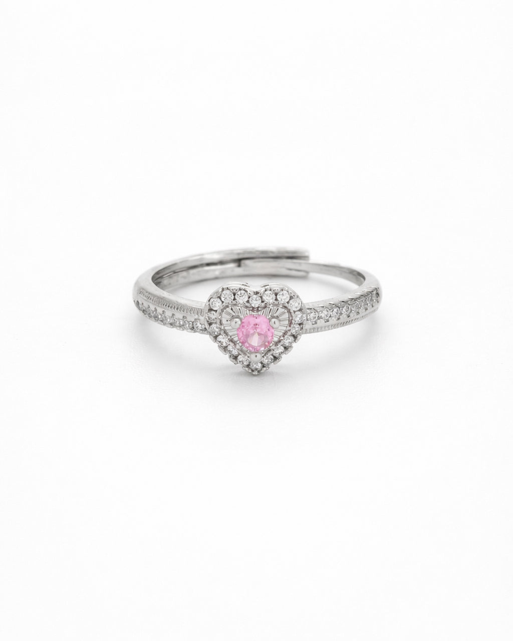 Anillo ajustable en tono plata brillante, con delicado diseño de corazón decorado con zirconias que realzan su contorno, y zirconia rosa central