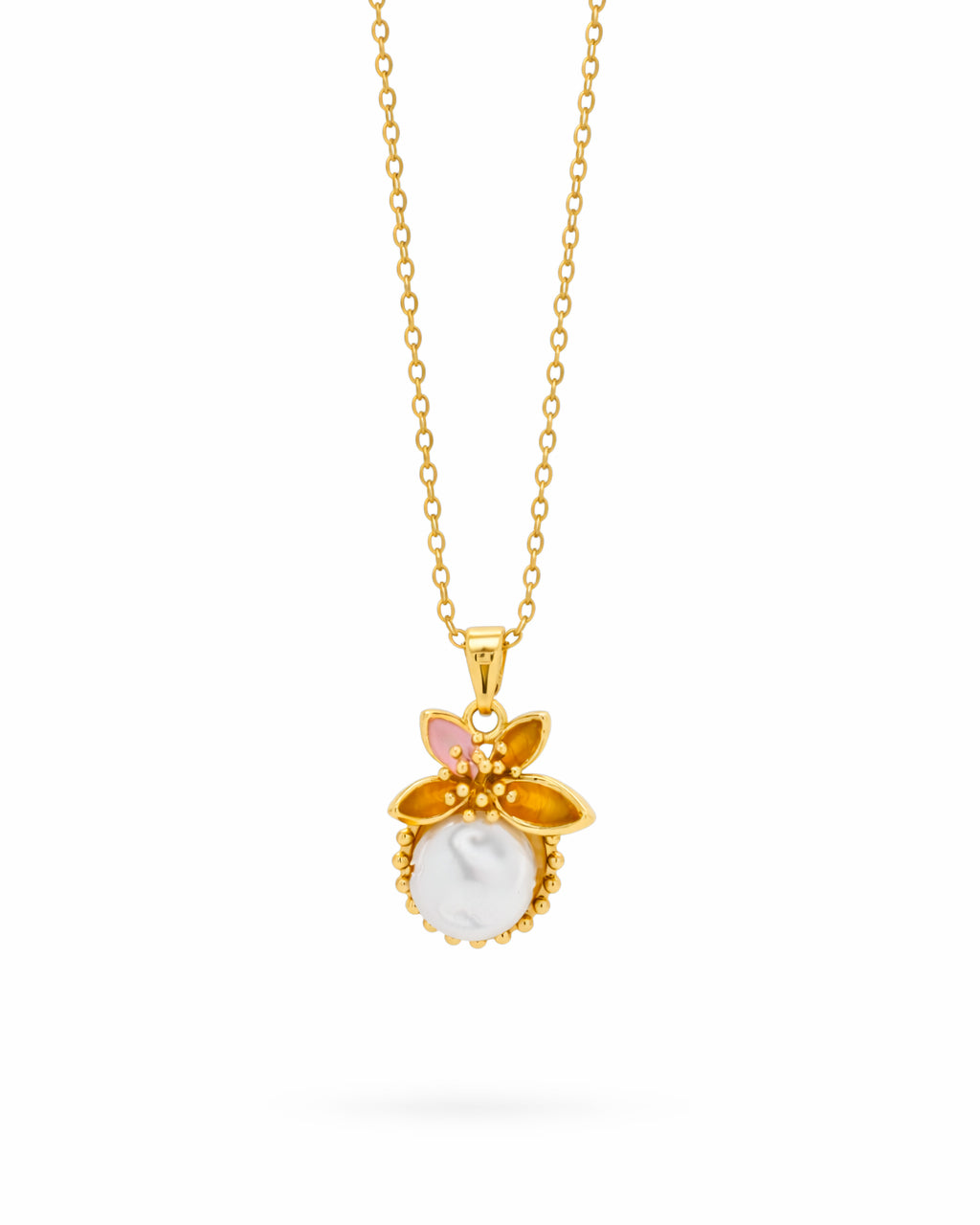 Collar de fantasía con dije en diseño de flor, decorado con pétalos esmaltados en tonos suaves y un detalle central tipo perla sintética.
