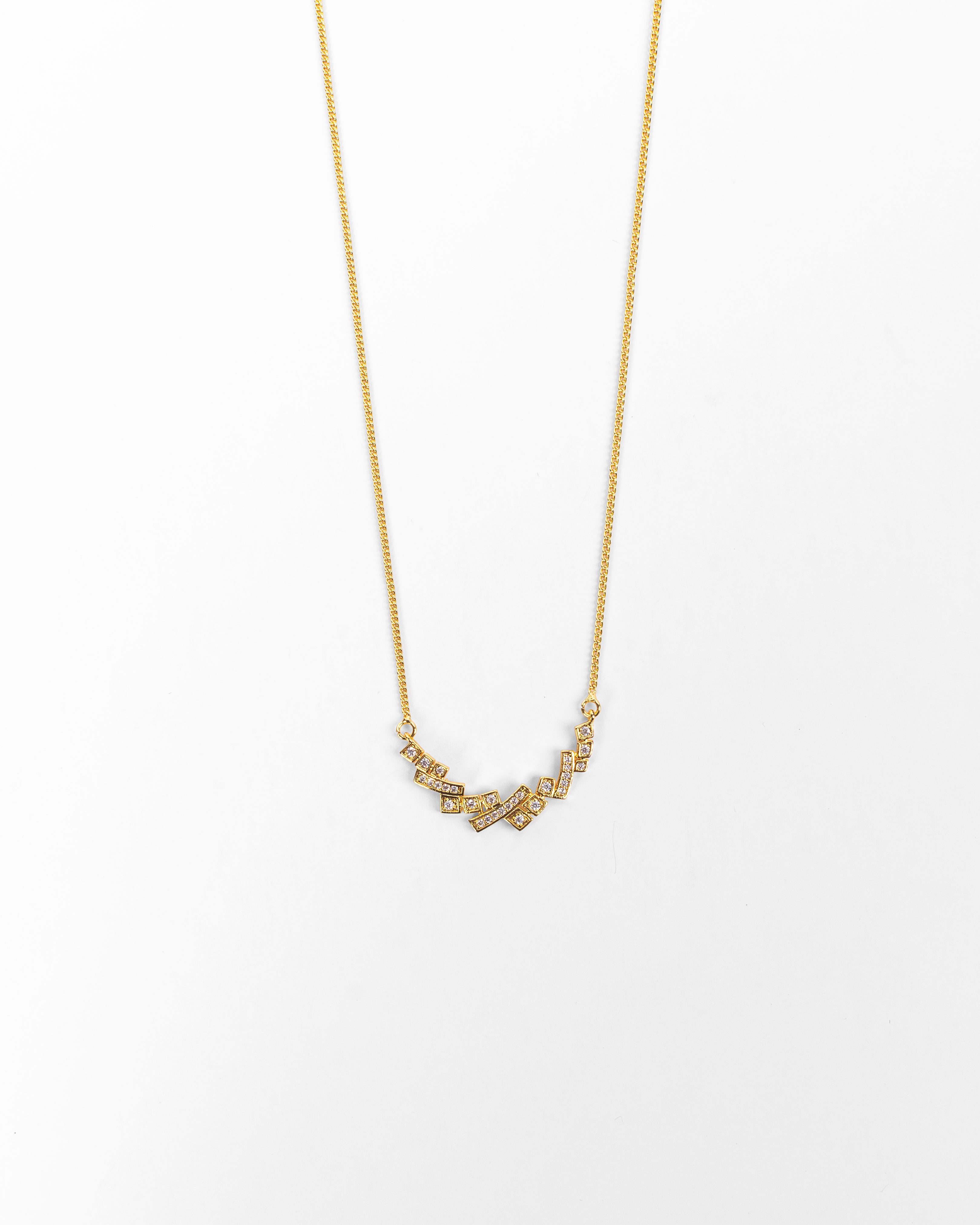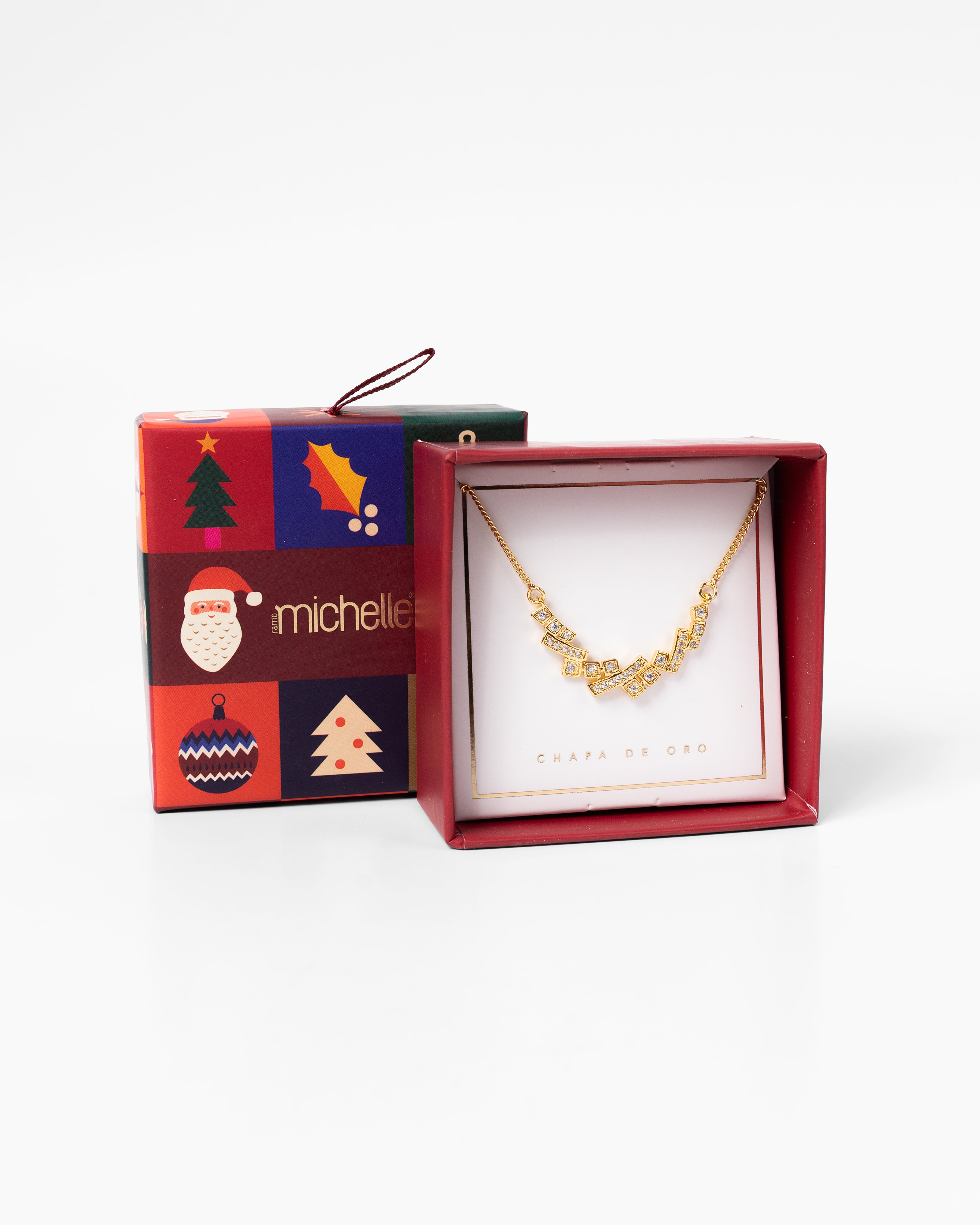 Collar de chapa de oro color dorado brillante con diseño geométrico curvado decorado con zirconias en corte cuadrado y redondo.