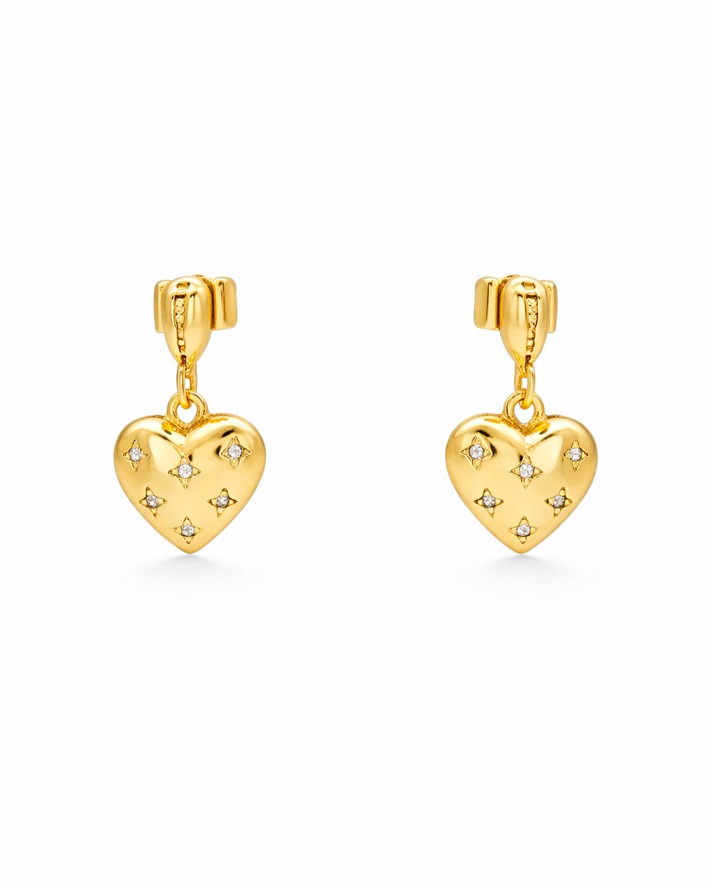 Aretes de chapa de oro con diseño de corazón, decorados con incrustaciones de zirconia.