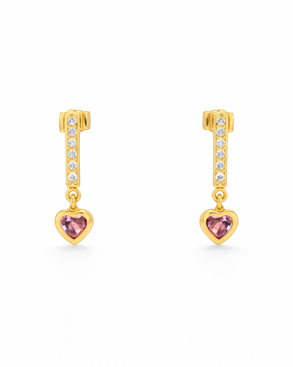 Aretes de chapa de oro con diseño colgante, decorados con zirconias incrustadas y un dije en forma de corazón con piedra color rosa.