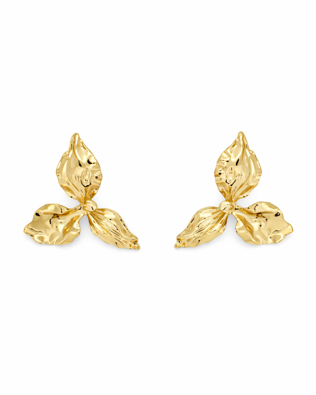 Aretes de chapa de oro con diseño orgánico en forma de hojas, con acabado texturizado y brillo pulido.
