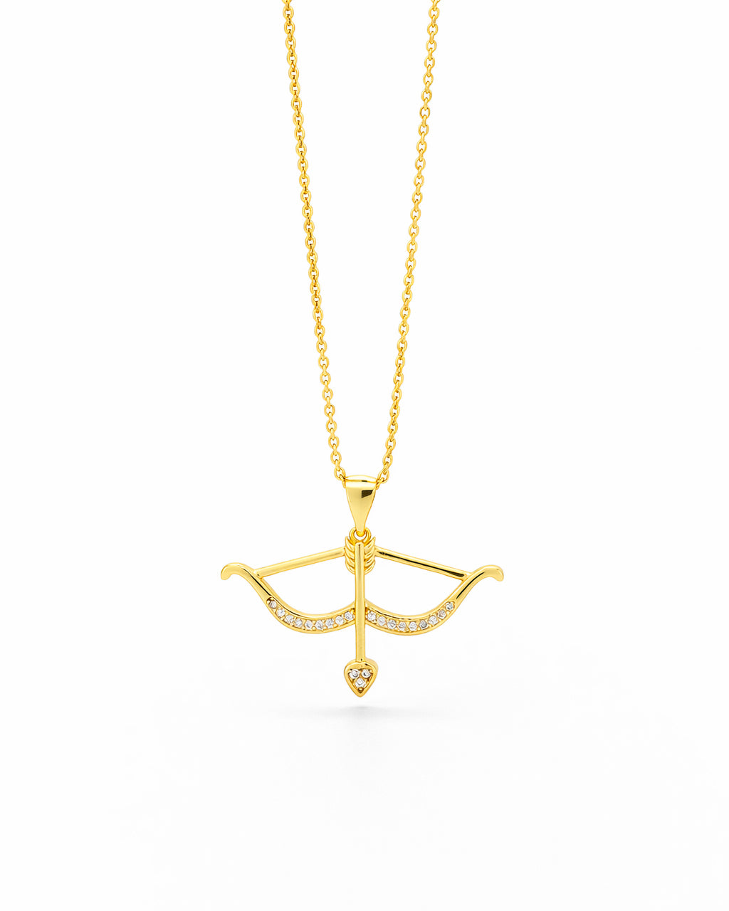 Collar de chapa de oro en tono dorado brillante, con delicado diseño de flecha de cupido de líneas finas y acabado pulido con detalles de zirconias.
