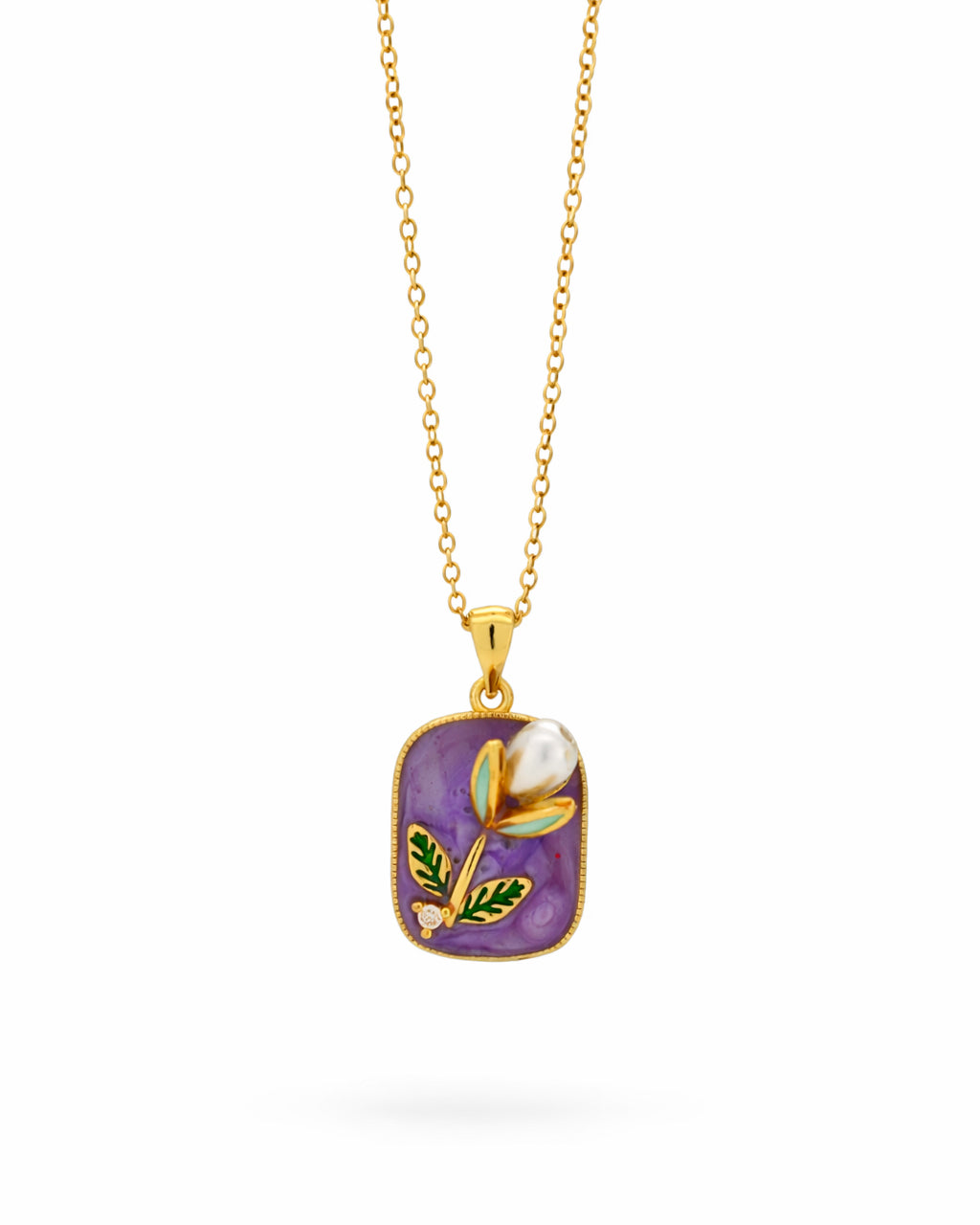 Collar de fantasía con dije rectangular, decorado con un delicado diseño floral. Presenta una flor en relieve con detalle tipo perla, hojas esmaltadas en tonos verdes y acentos en color dorado.