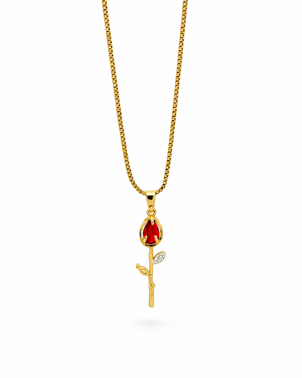Collar de chapa de oro en tono dorado brillante, con elegante diseño de rosa estilizada realzada por un cristal rojo de acabado luminoso. Detalles finamente trabajados y hoja decorada con zirconias