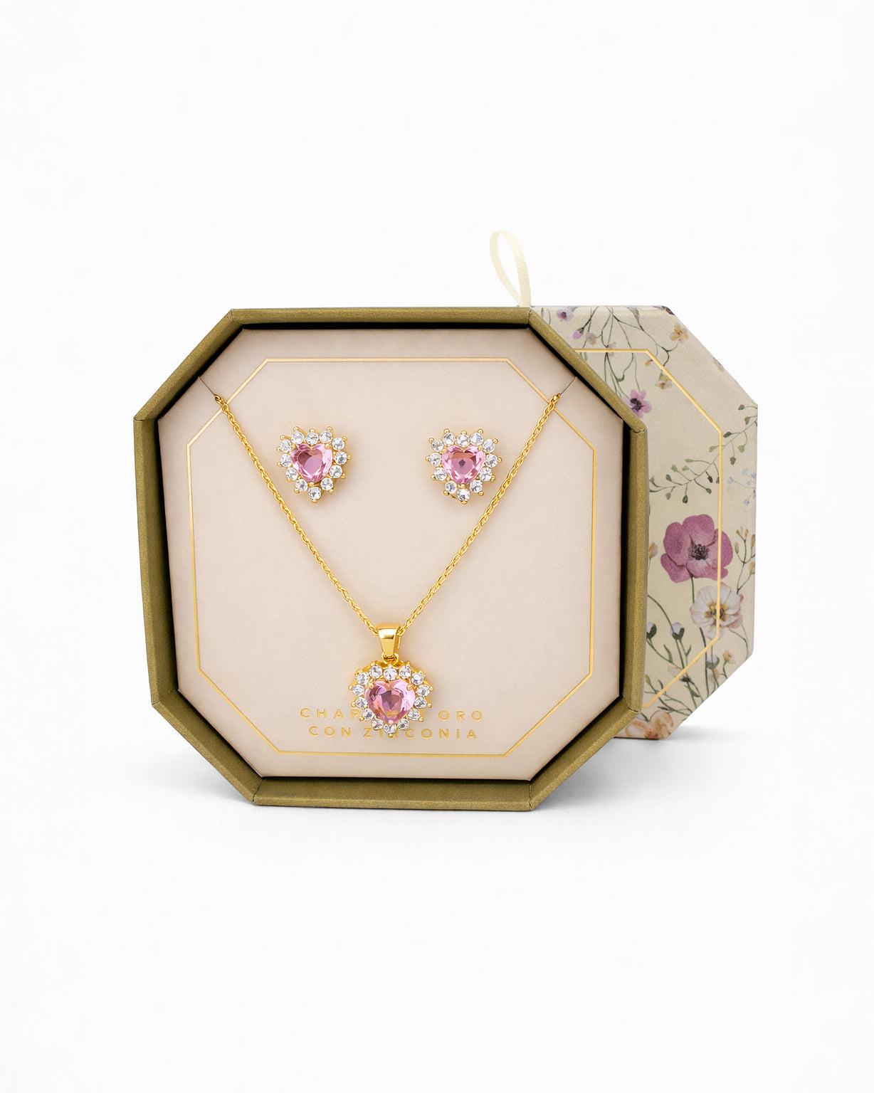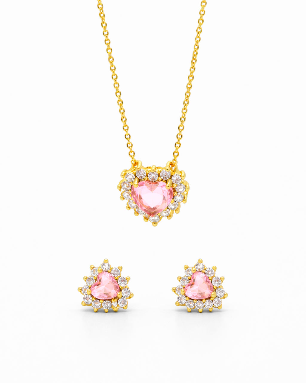 Conjunto de collar y aretes de chapa de oro en tono dorado brillante, con delicado diseño de corazón protagonizado por circonita rosa de corte facetado rodeado de circonitas.