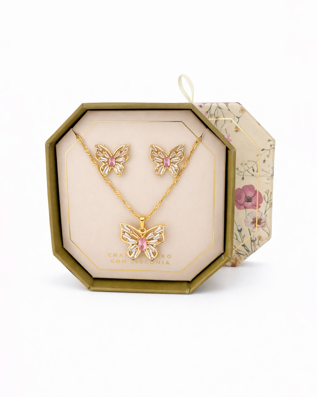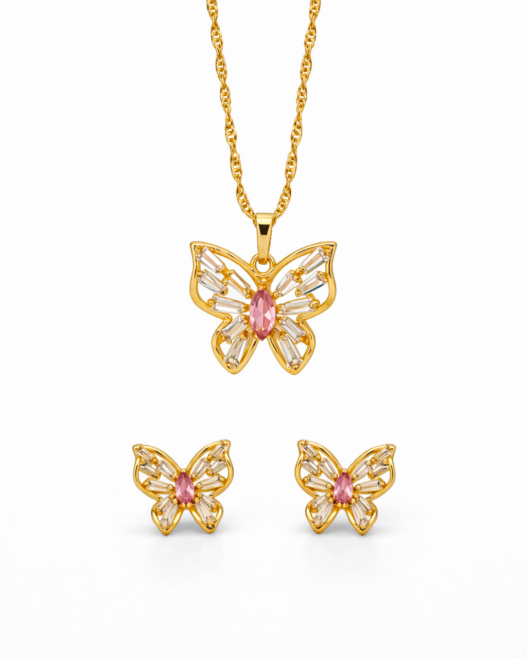 Set de collar y aretes de chapa de oro en tono dorado brillante, con delicado diseño de mariposa formado por zirconias claras de corte alargado y zirconia central rosa.
