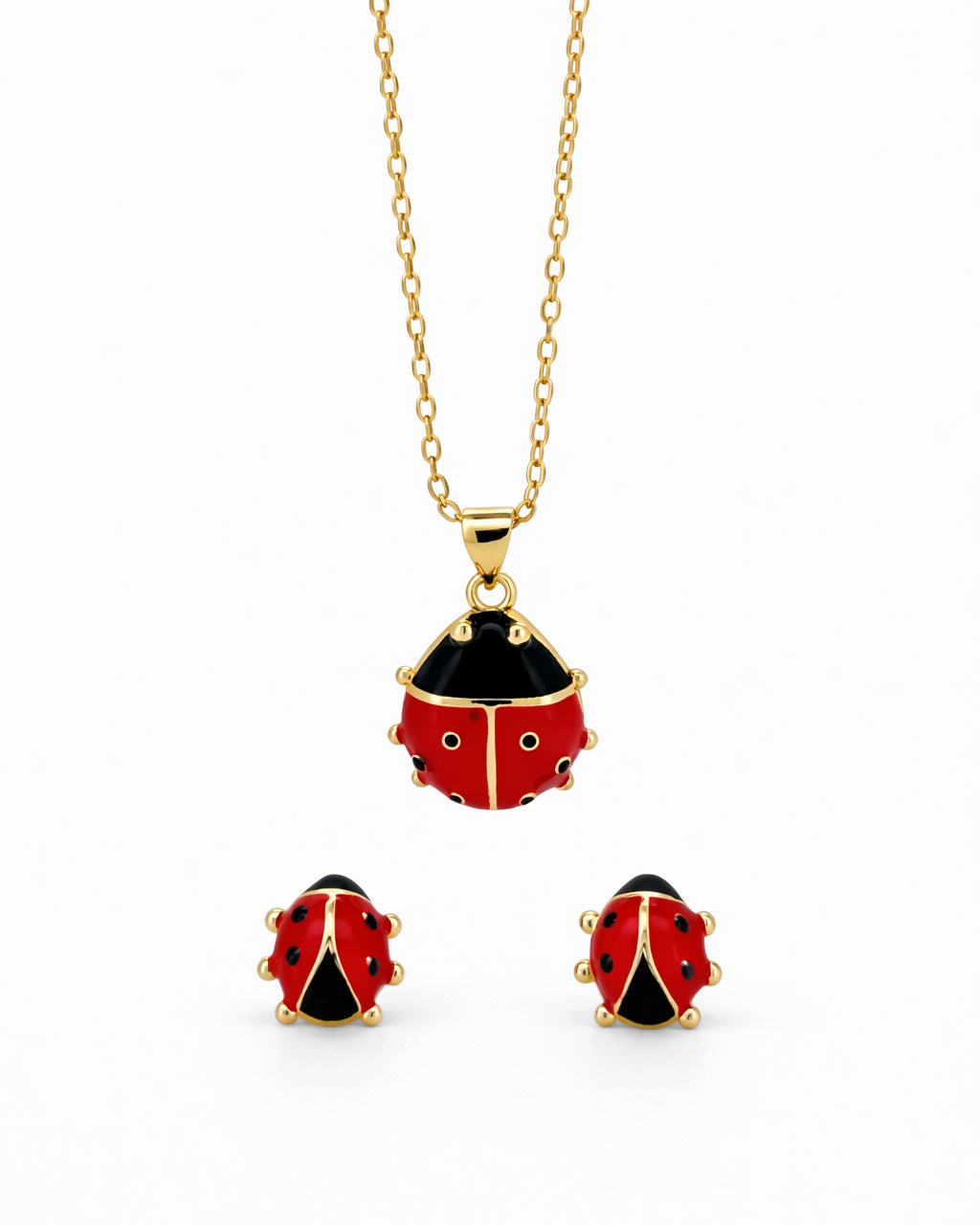 Set de collar y aretes de chapa de oro en tono dorado brillante, con encantador diseño de catarina esmaltada en rojo y negro.