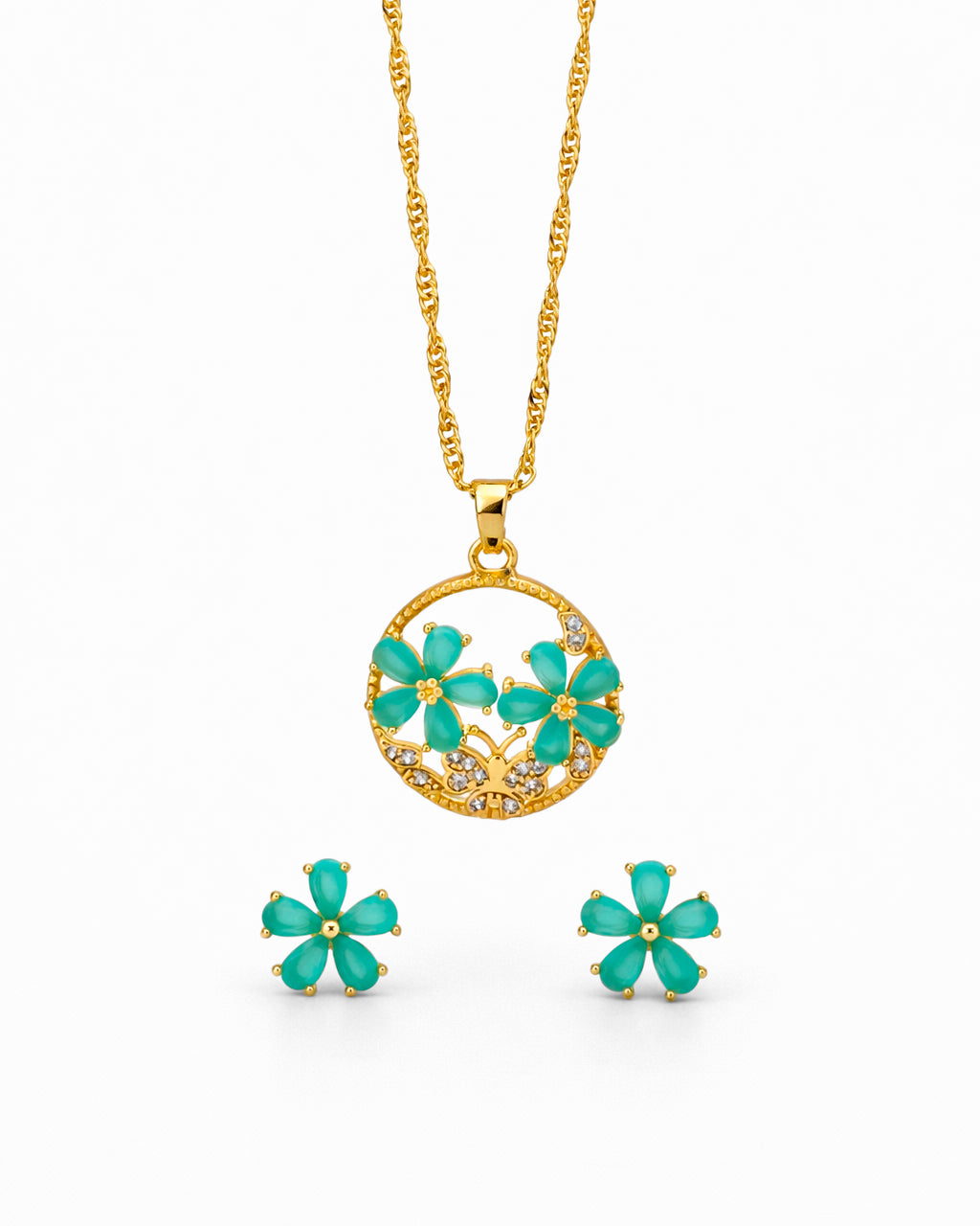 Set de collar y aretes de chapa de oro en tono dorado brillante, con delicado diseño circular decorado con flores en tono verde agua de acabado suave y luminoso. Detalles de zirconias claras que aportan un brillo sutil y refinado.