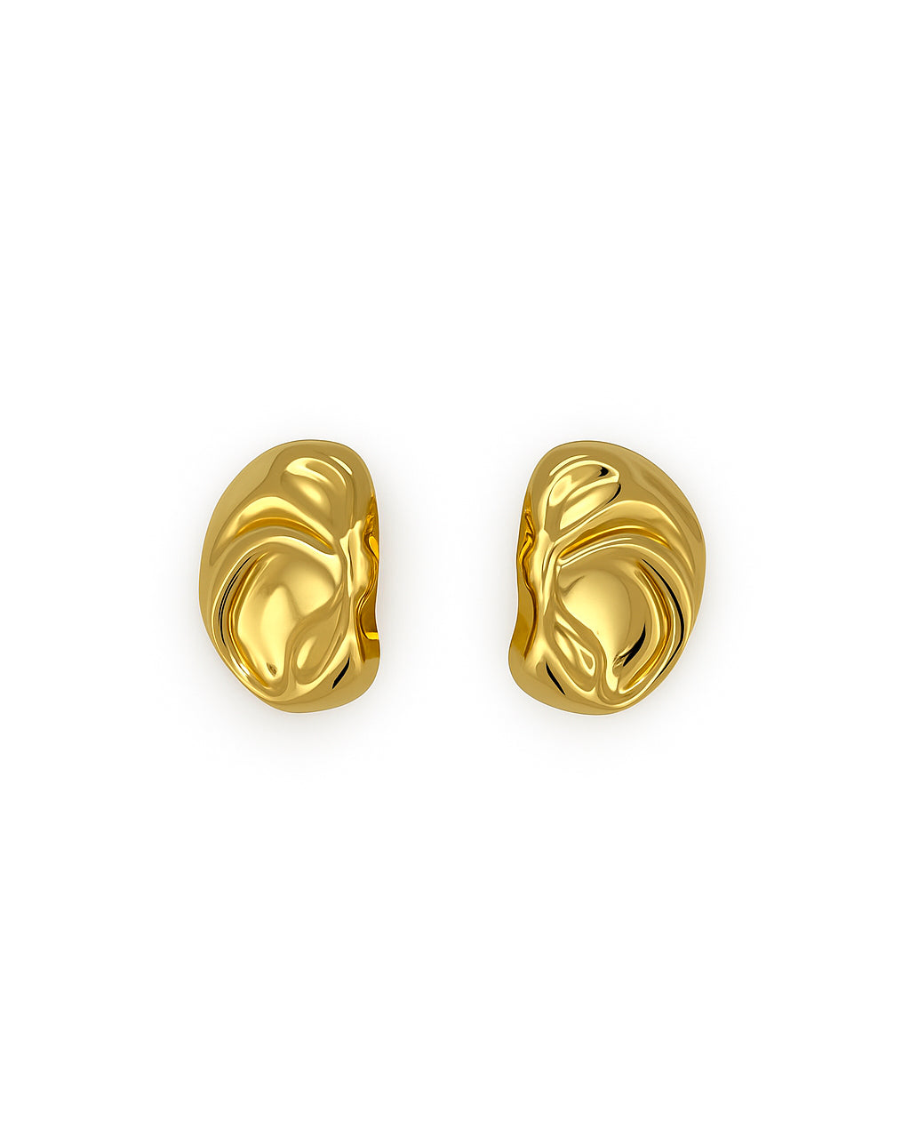 Aretes de chapa de oro con acabado espejo y forma orgánica ondulada. Su superficie pulida refleja la luz con elegancia, creando un estilo moderno y sofisticado.