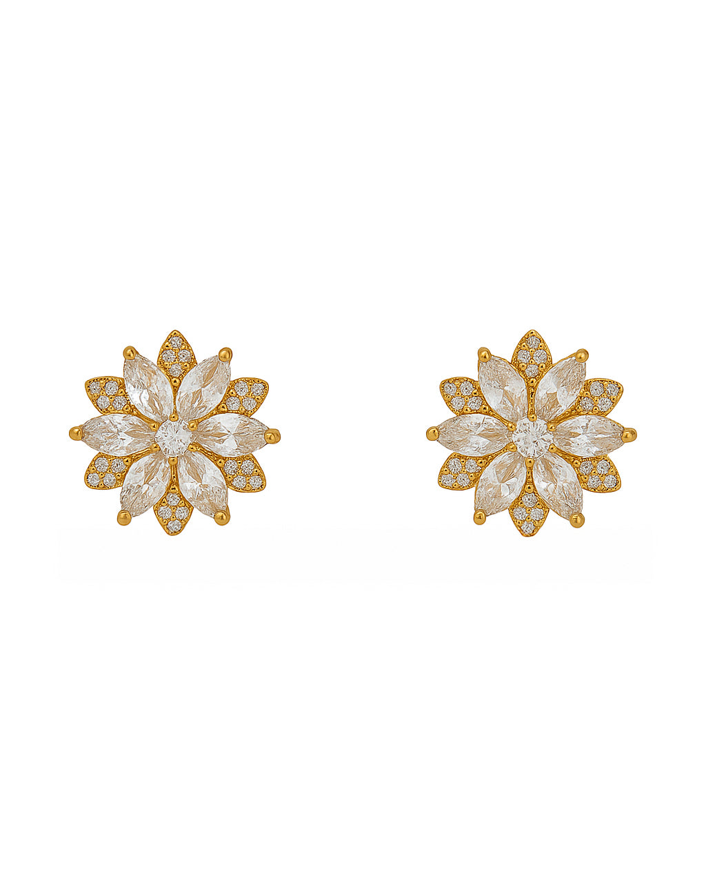 Aretes con diseño de flor compuesta por zirconias marquise y pavé brillante. Su acabado dorado realza el destello de cada piedra, creando un estilo elegante y luminoso para toda ocasión.