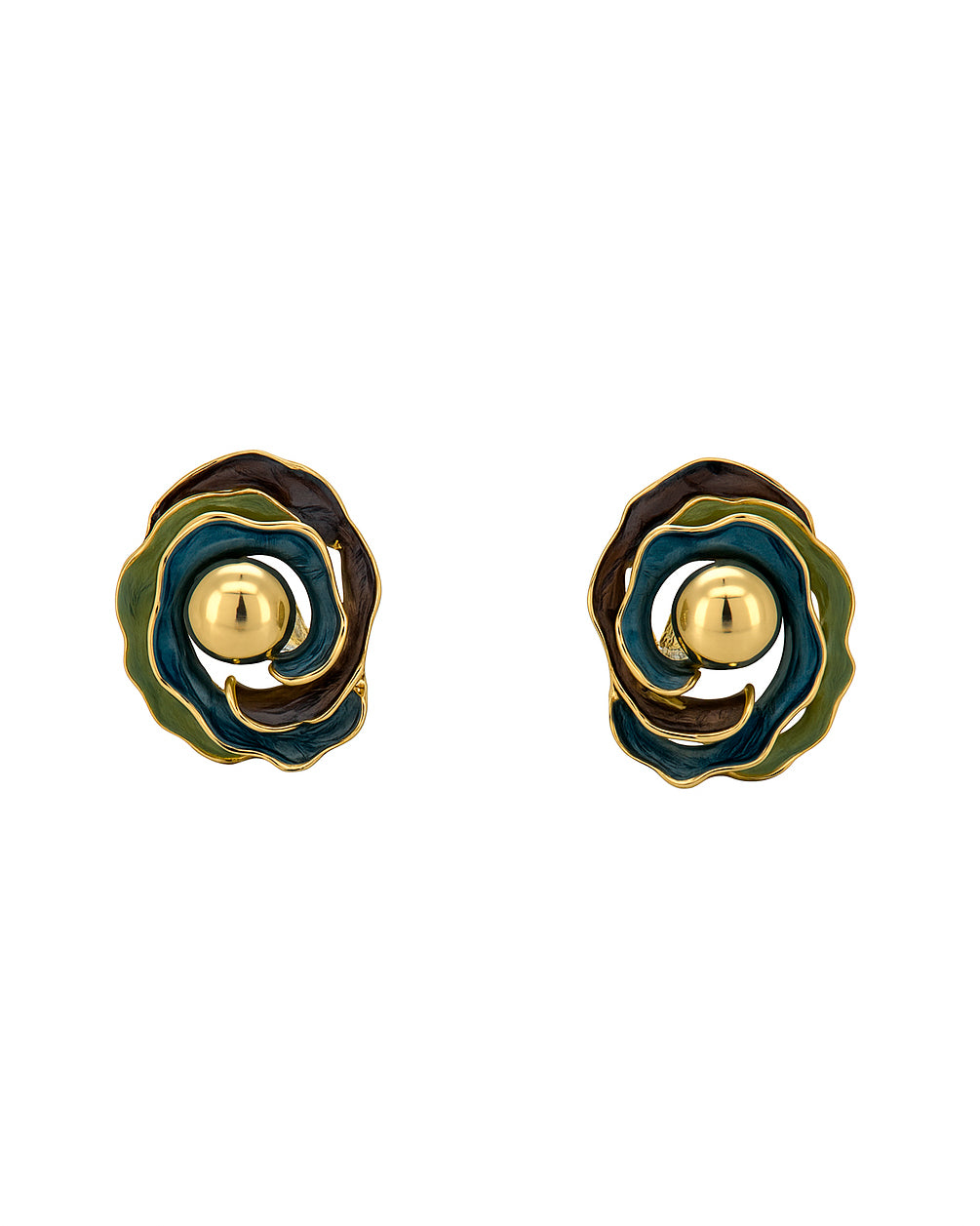 Aretes de chapa de oro con pétalos esmaltados en tonos verde, azul, morado y centro dorado brillante. Diseño de clip cómodo que no requiere perforación, ideal para un toque artístico y elegante.