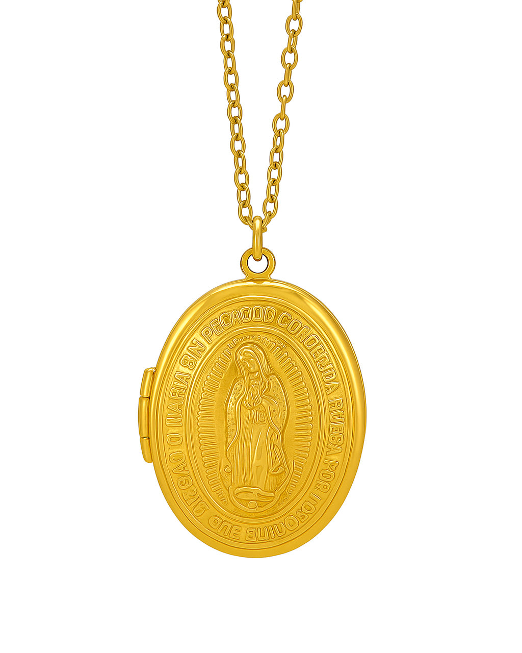 Collar de acero inoxidable con baño dorado cálido y acabado espejo, el dije ovalado muestra a la Virgen en relieve con bordes grabados y un interior liso tipo relicario.