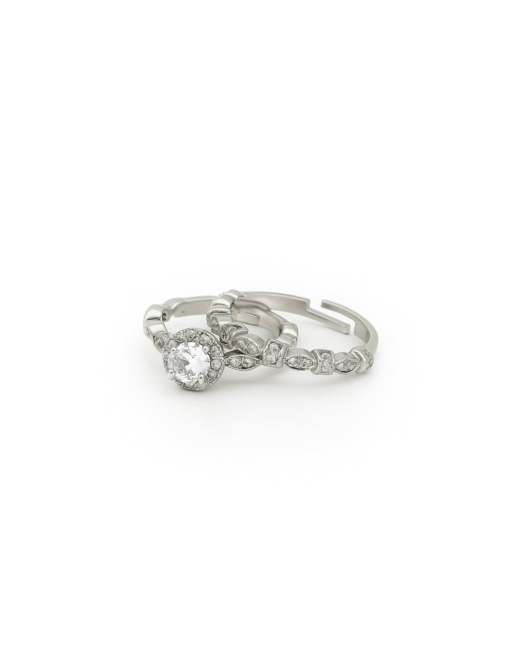 Juego de anillos ajustables color plata brillante con zirconias incrustadas y piedra central redonda rodeada de un halo de brillo. Un diseño delicado y elegante ideal para cualquier ocasión.