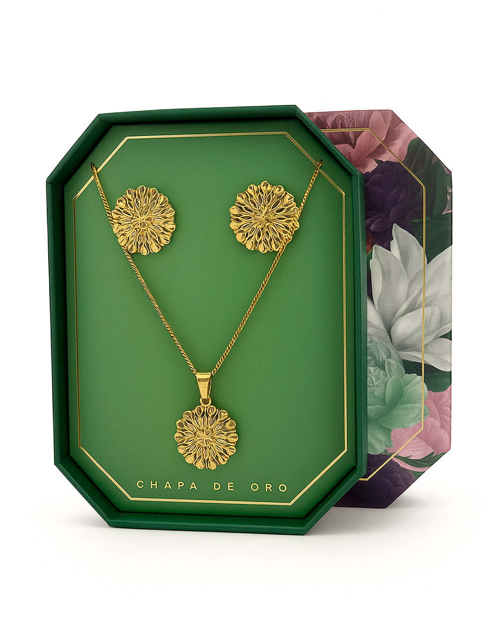 Set de chapa de oro con acabado brillante y diseño en forma de flor tallada. Incluye collar con dije redondo y aretes a juego, ambos con textura en relieve que refleja la luz con elegancia.