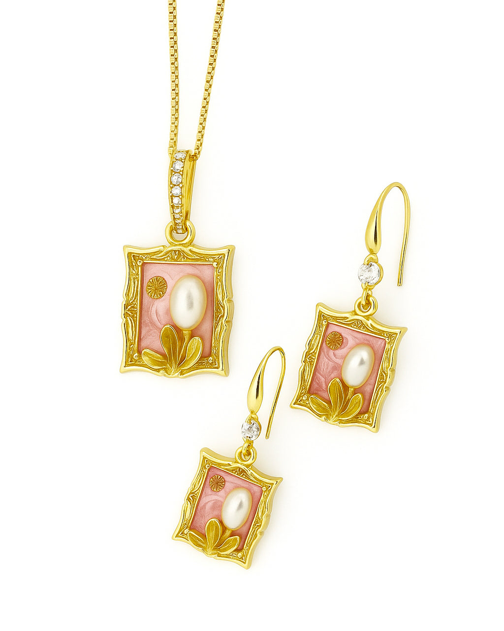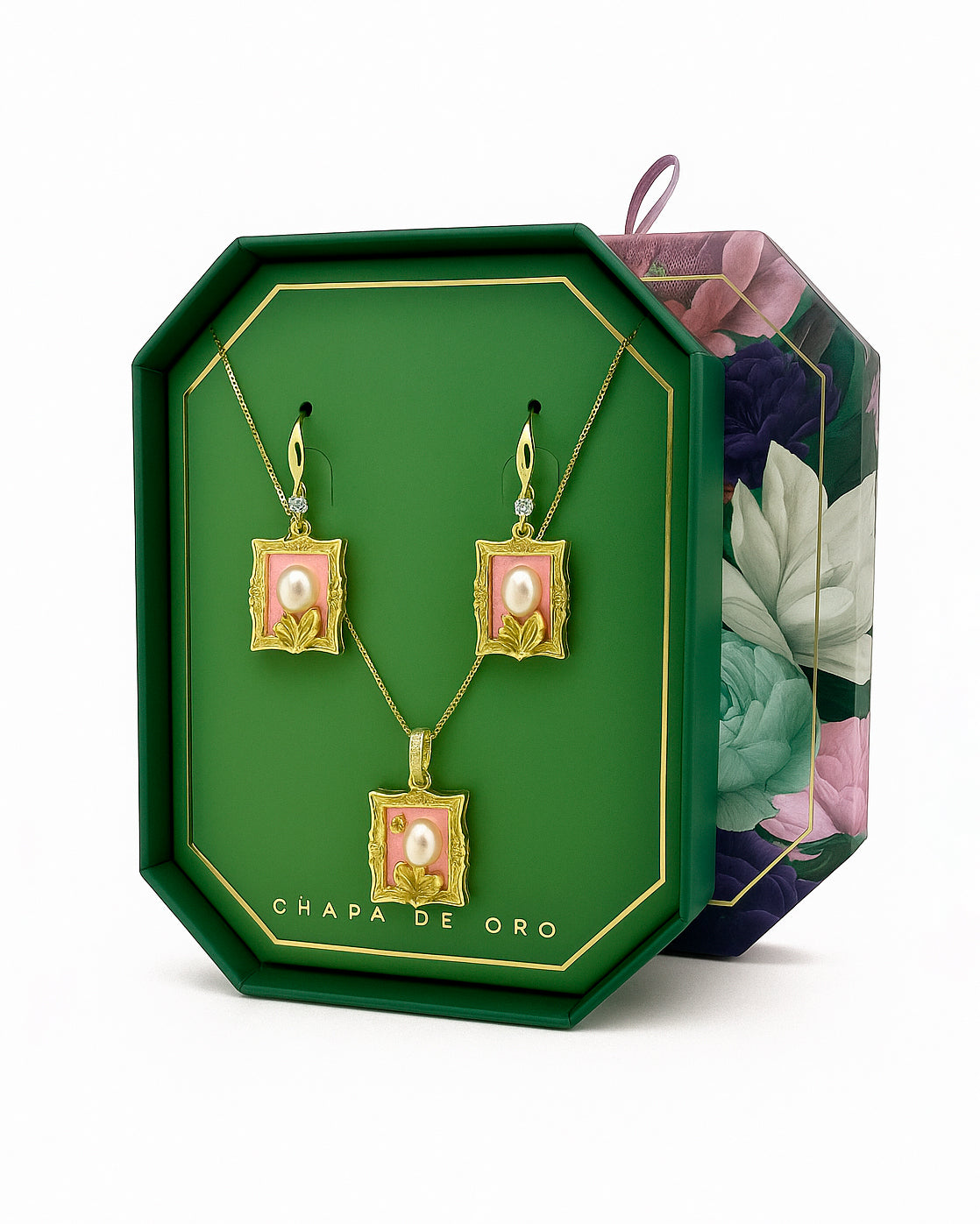 Set de chapa de oro con dije y aretes rectangulares decorados con fondo rosado nacarado, perla oval al centro y detalles florales en relieve. El engaste superior con zirconias añade un toque de brillo sutil y elegante.