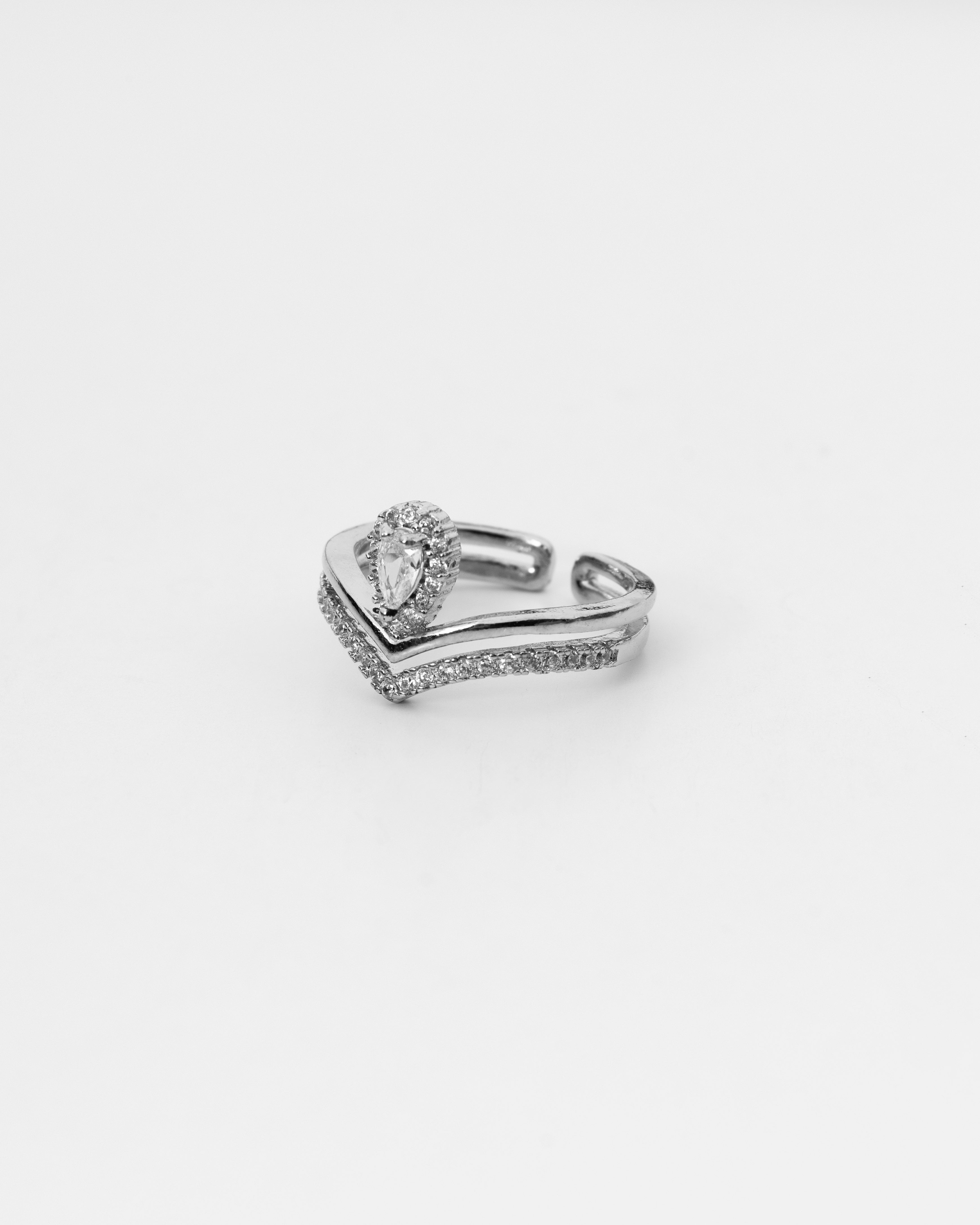 Anillo de chapa de oro color plata brillante con diseño abierto, decorado con zirconia central en corte lágrima y micro zirconias en el contorno.