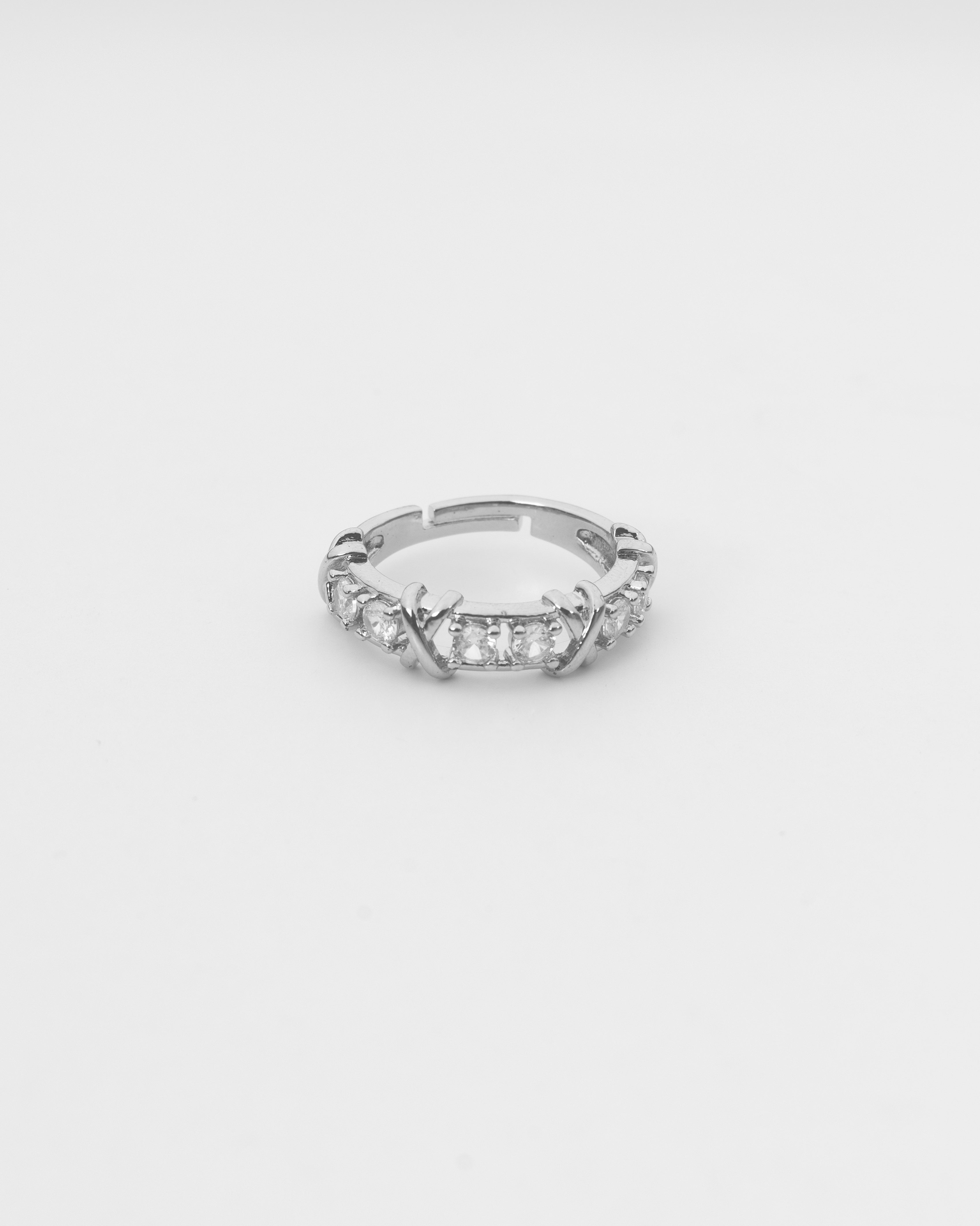 Anillo ajustable de chapa de oro color plata brillante con diseño de engaste cruzado decorado con zirconias en corte redondo.