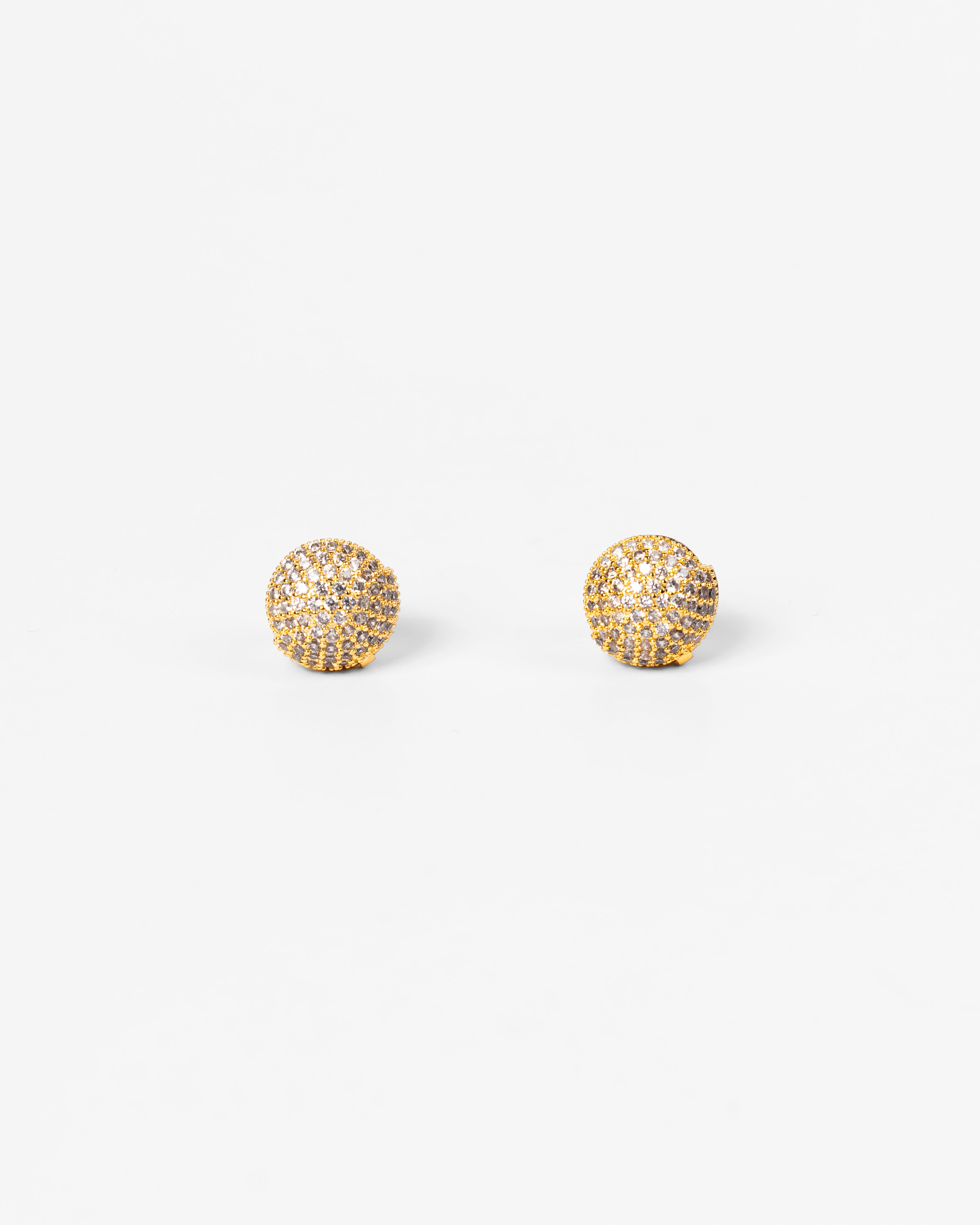 Aretes de chapa de oro color dorado brillante con diseño de esfera completamente decorada con micro zirconias incrustadas.