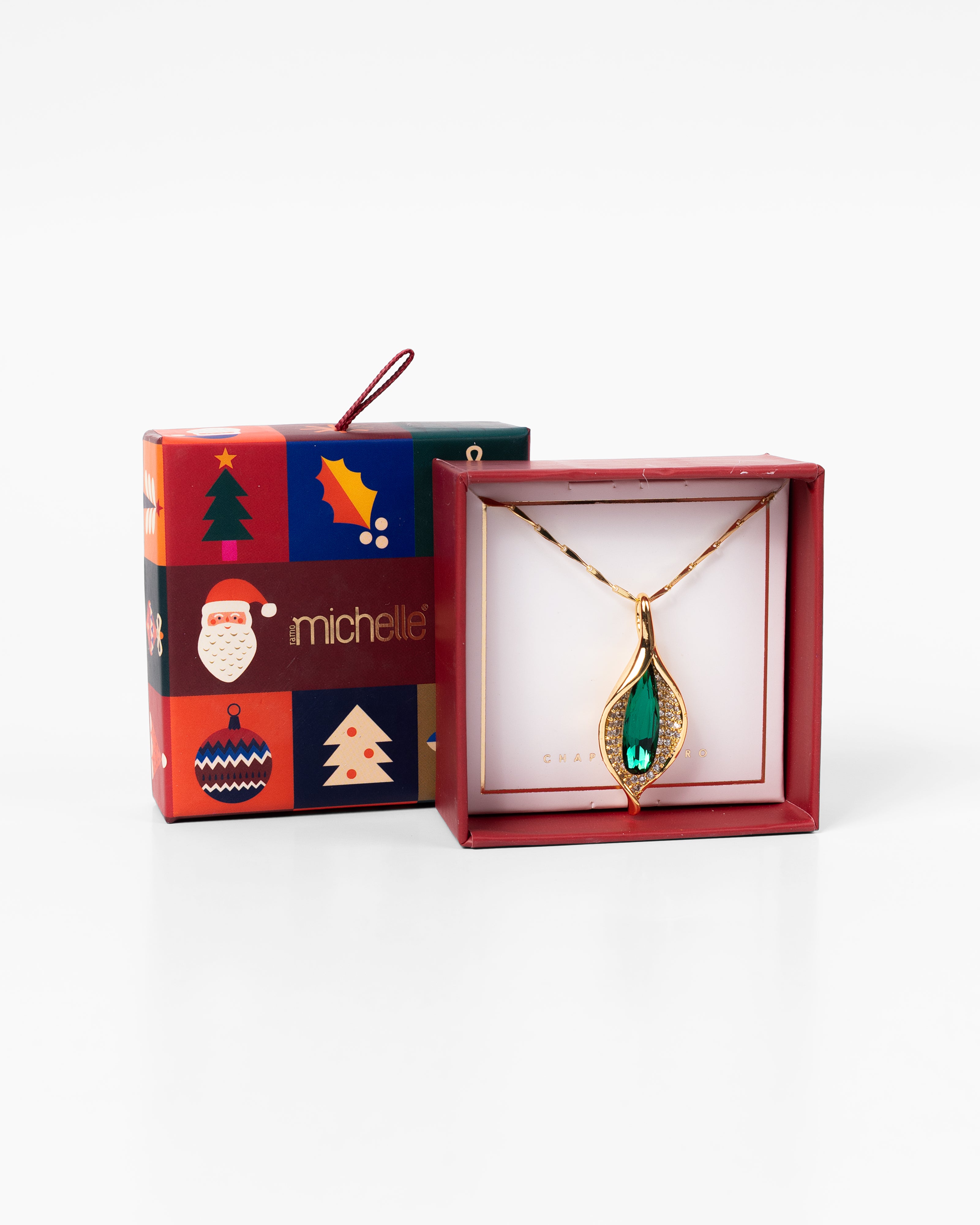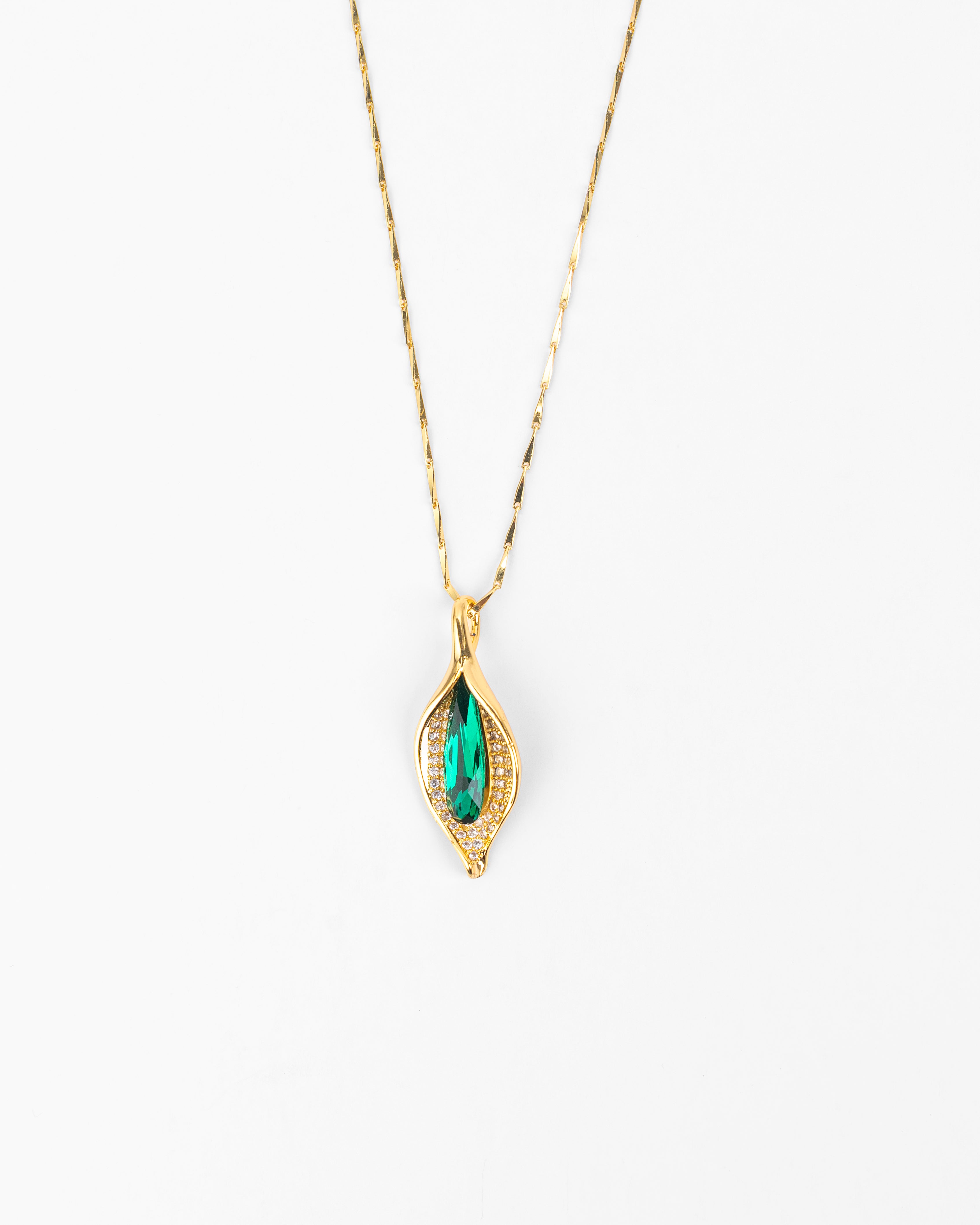 Collar de chapa de oro color dorado brillante con dije alargado en forma flor y de gota, decorado con piedra verde central y borde de zirconias.