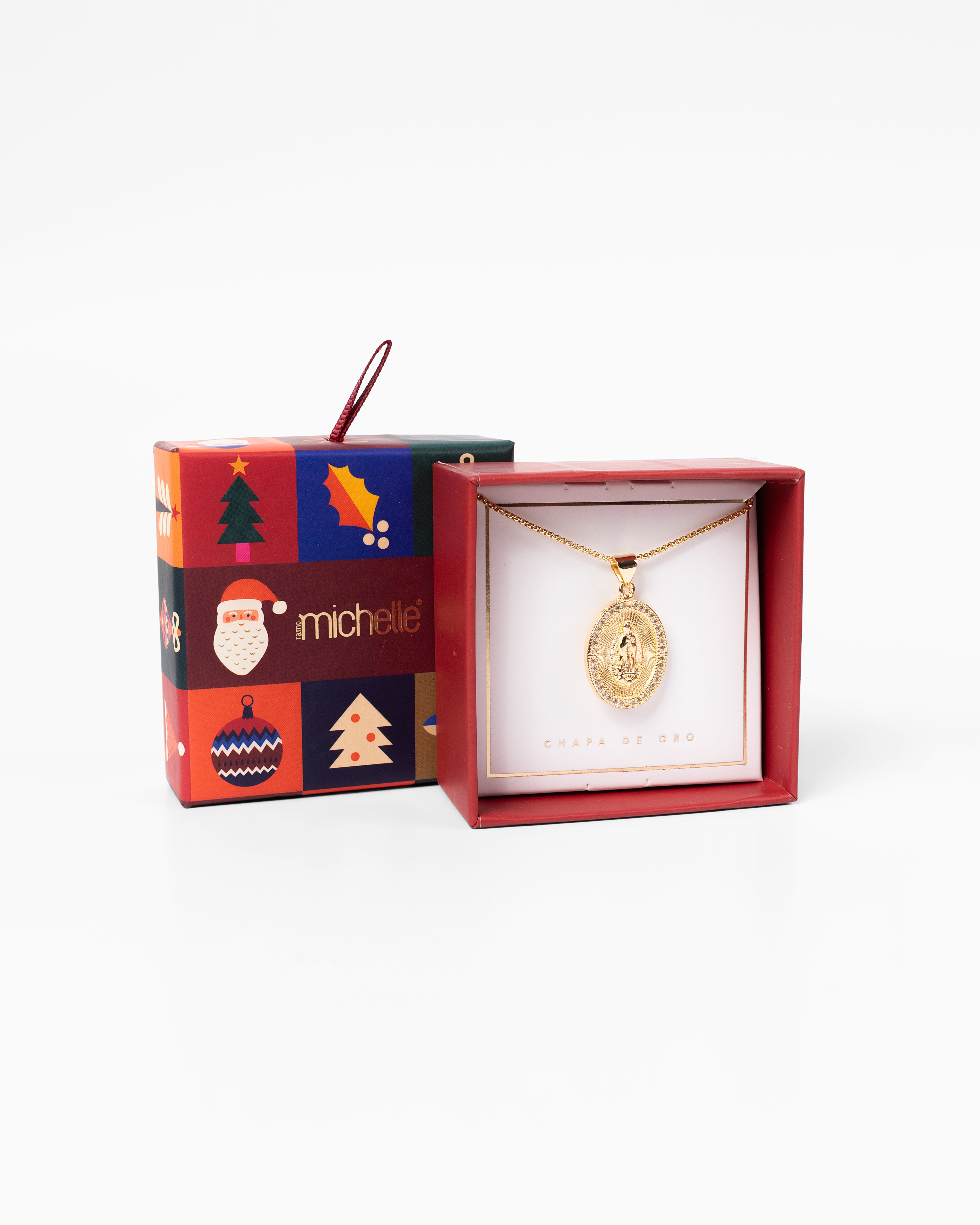 Collar de chapa de oro color dorado brillante con dije ovalado de la Virgen de Guadalupe y borde texturizado con acabado brillante.