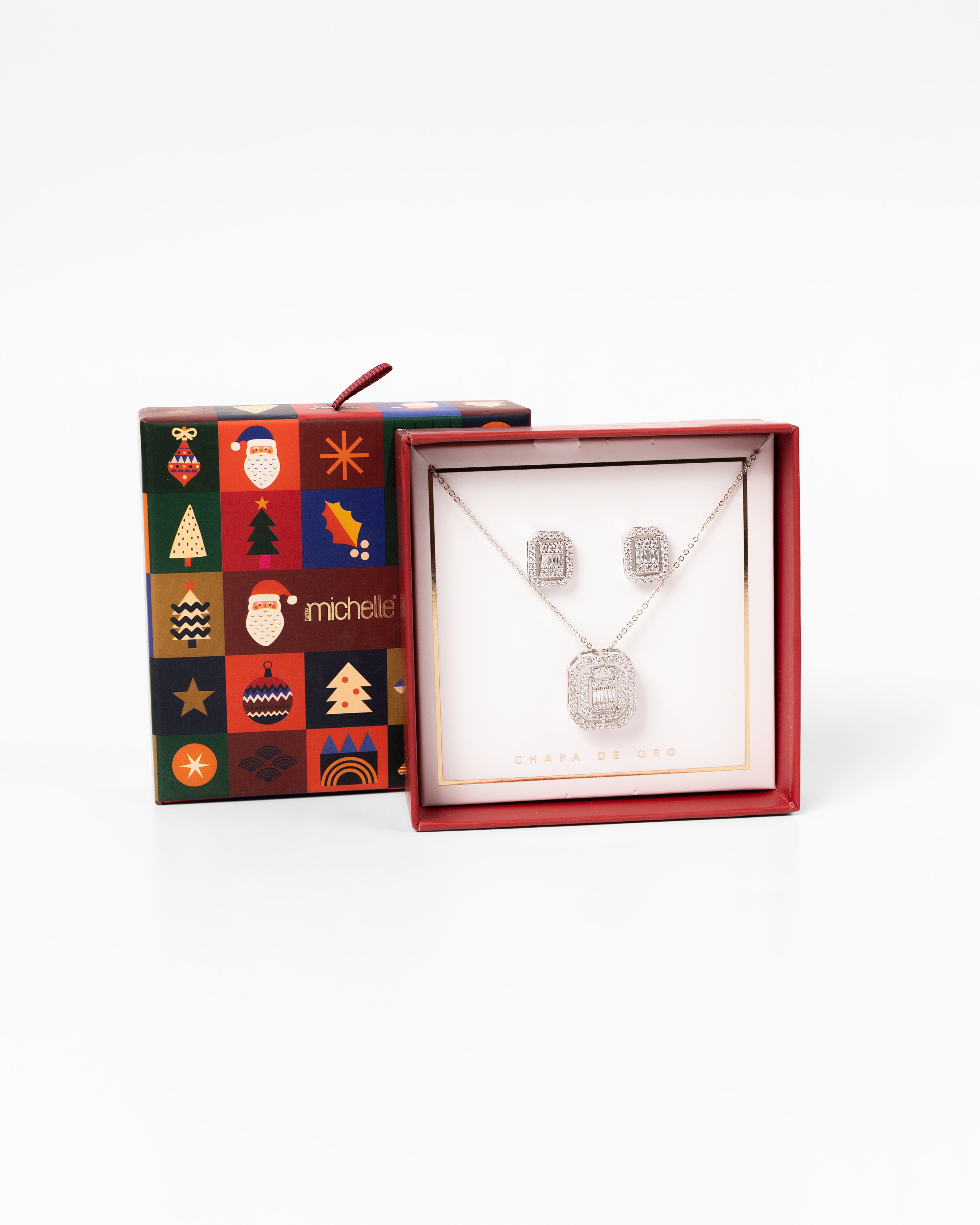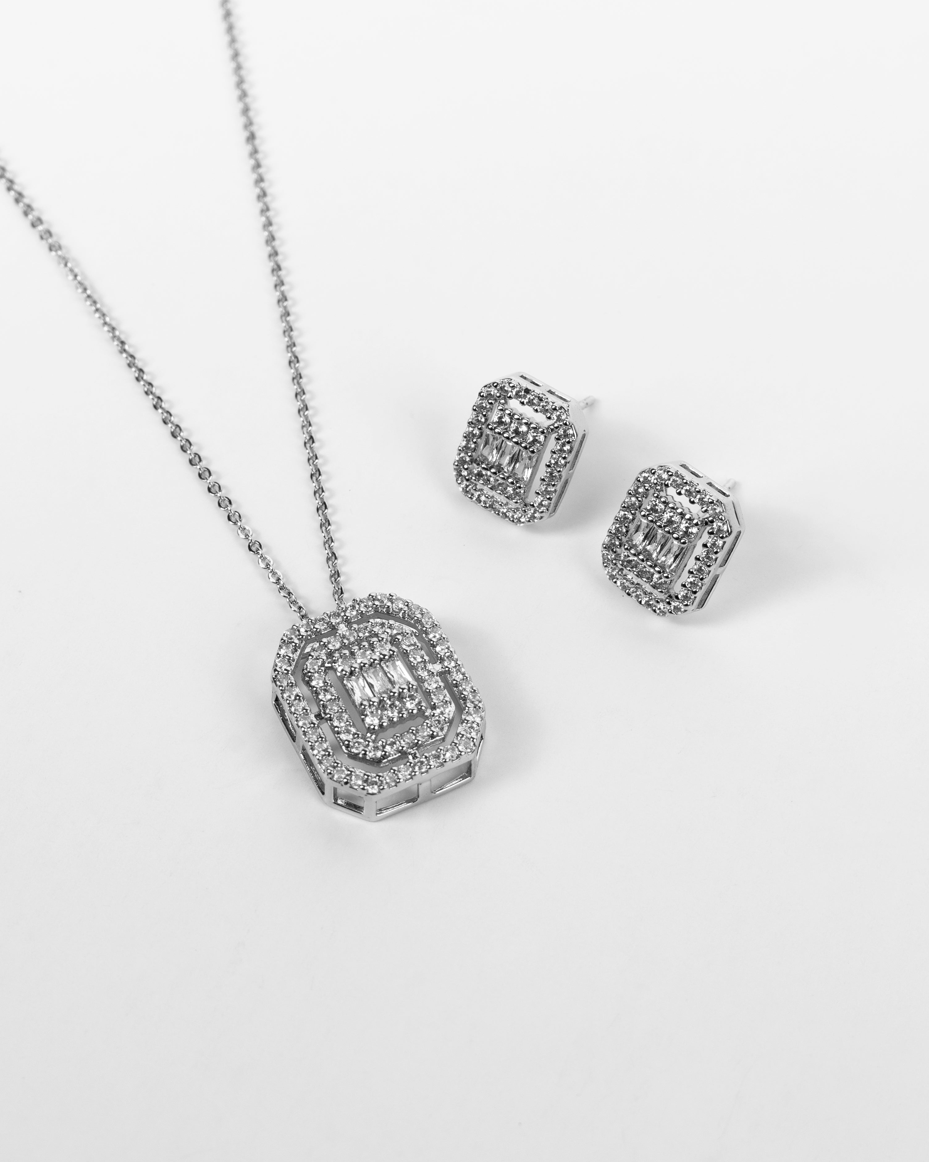 Set de aretes y collar de chapa de oro color plata brillante con diseño rectangular, decorado con zirconias en corte baguette y marco doble de micro zirconias.
