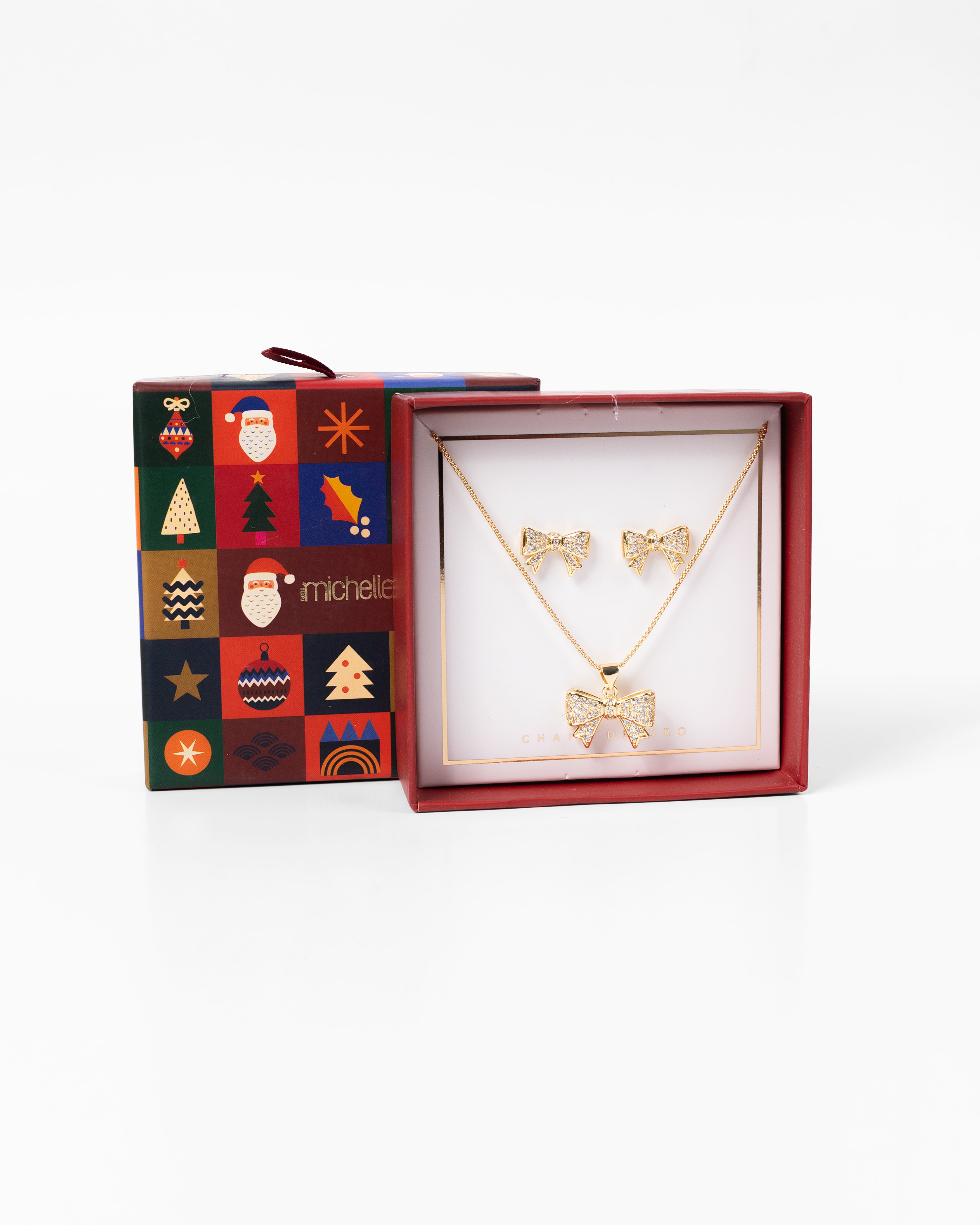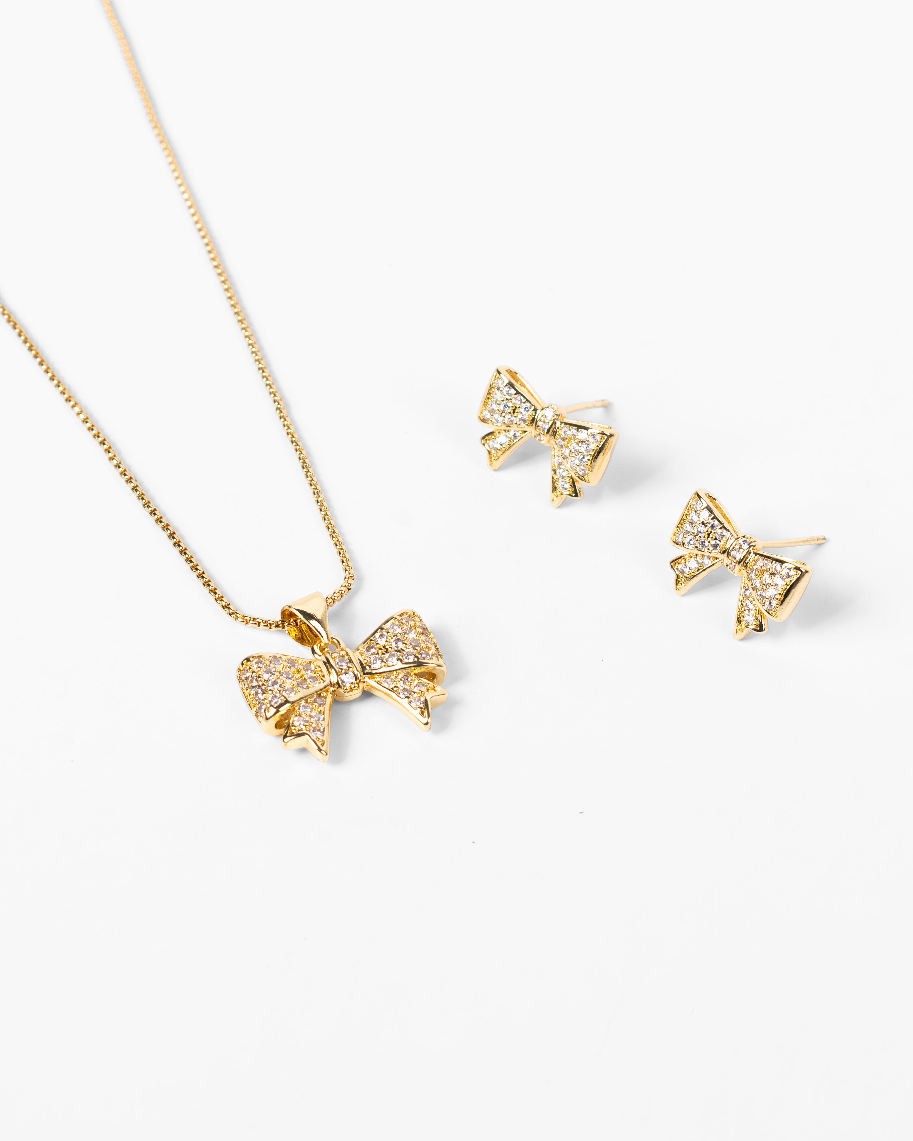 Set de aretes y collar de chapa de oro color dorado brillante con diseño de moño decorado con zirconias incrustadas en corte redondo.