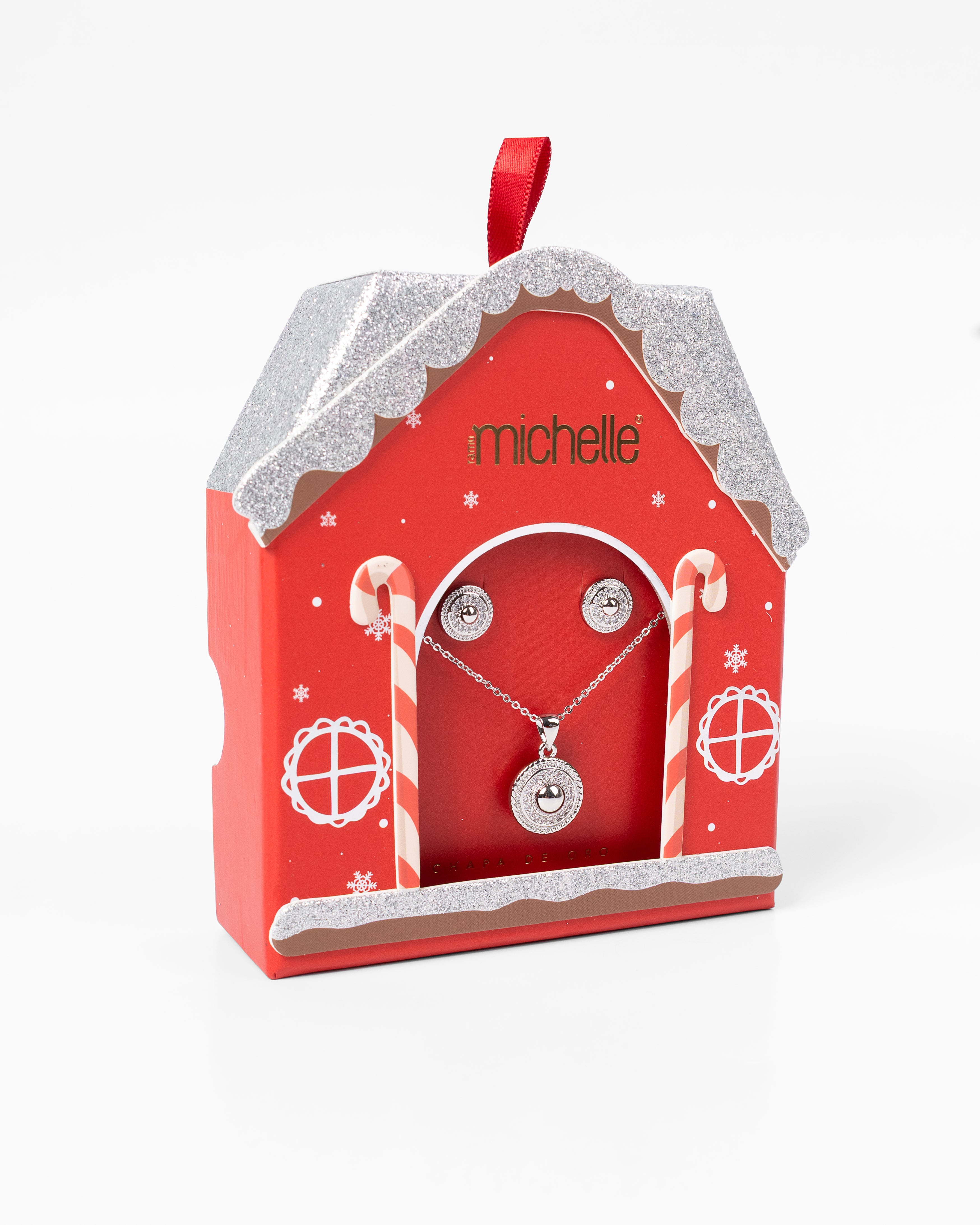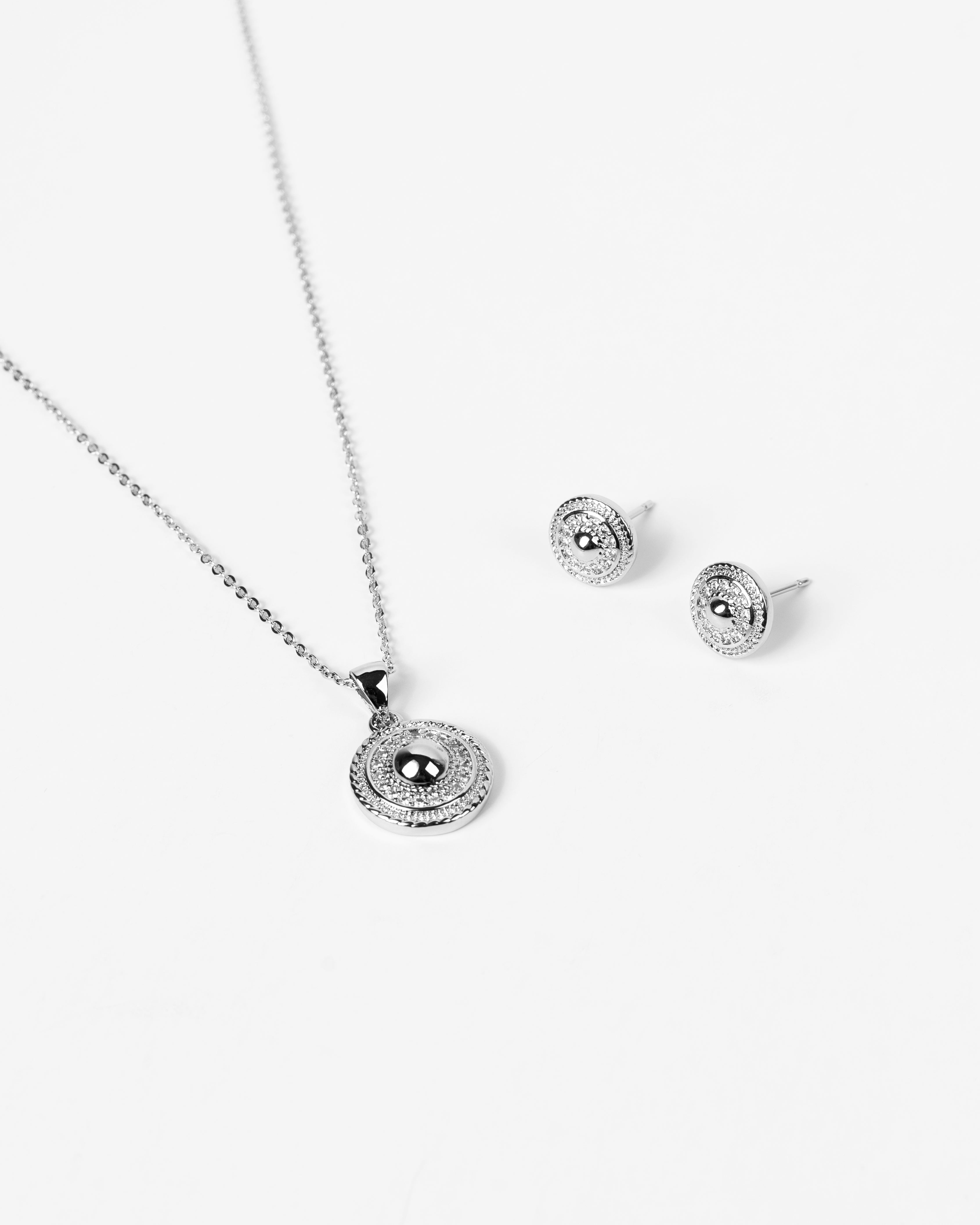 Set de aretes y collar de chapa de oro color plata brillante con dije y aretes circulares decorados con zirconias y detalle central metálico.