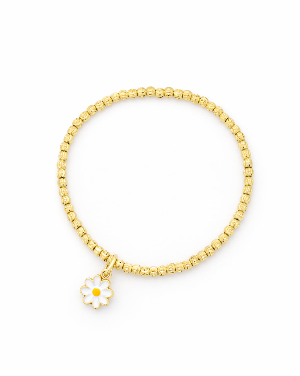 Pulsera de cuentas de chapa de oro en tono dorado brillante, con acabado pulido que aporta un brillo delicado y uniforme, incluye un dije de flor esmaltada en blanco con centro amarillo.